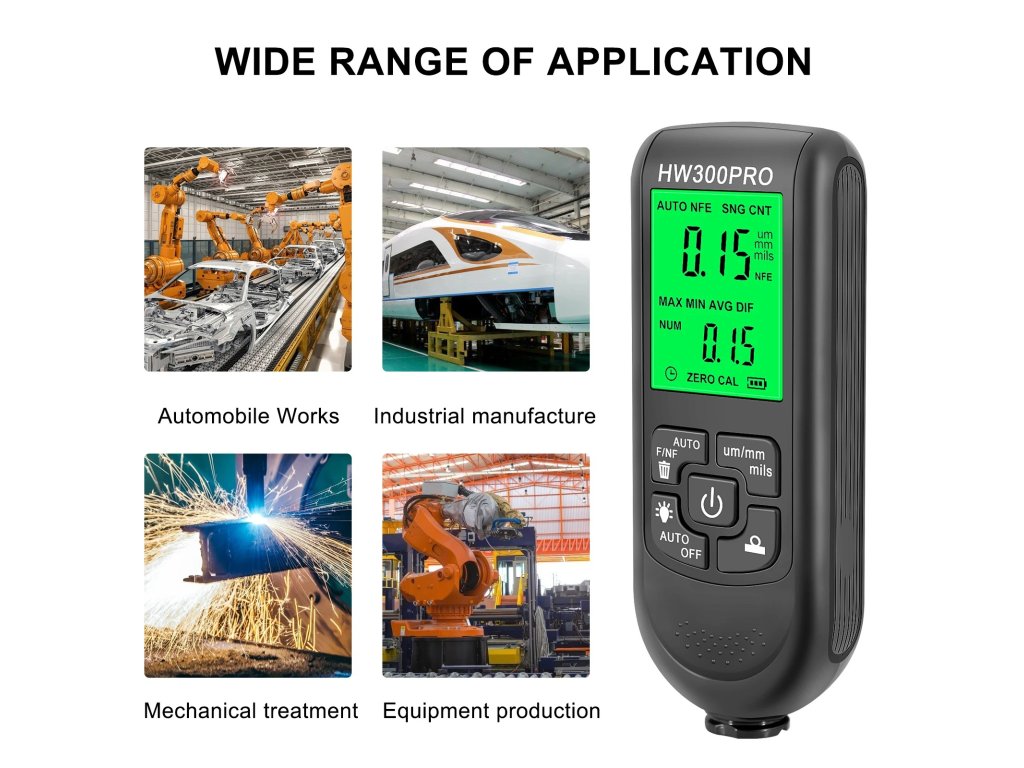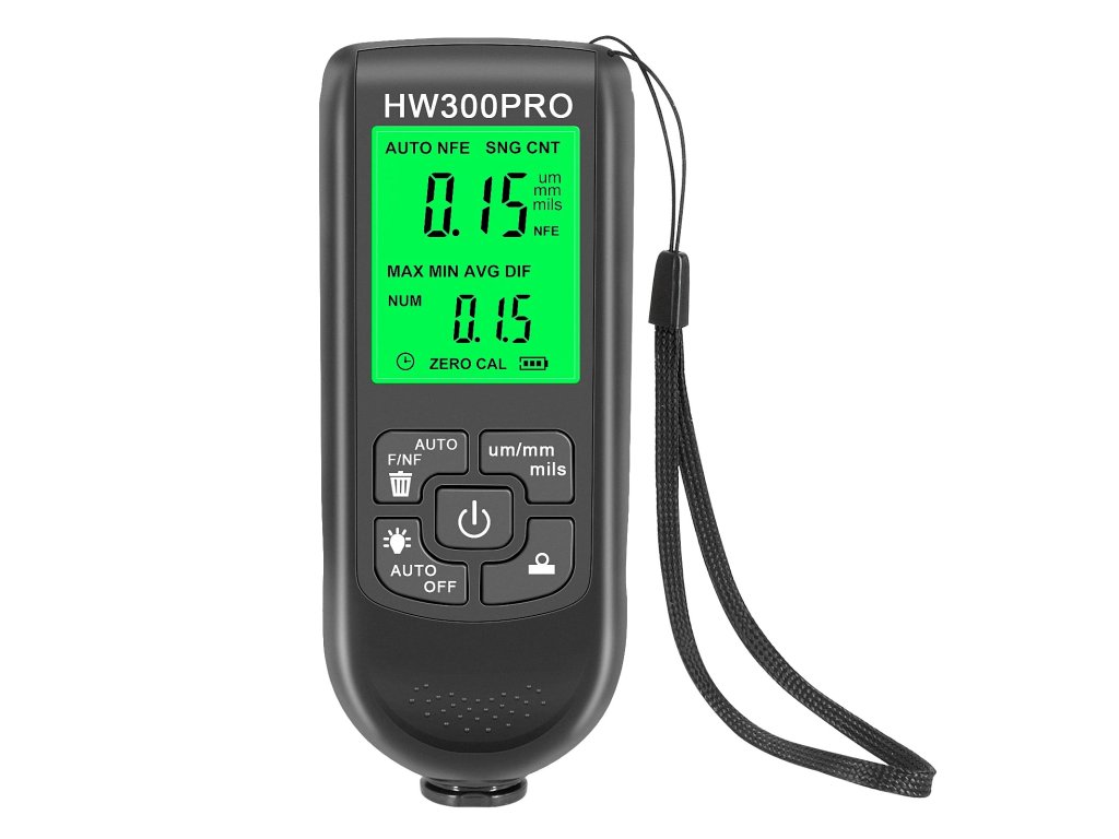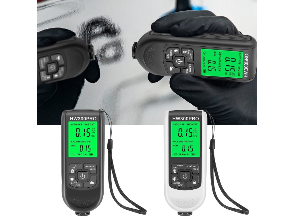 Model HW-300PRO je profesionálny elektronický merač hrúbky náterov, navrhnutý na presné meranie hrúbky laku na oceli a hliníku. Vďaka automatickej detekcii podkladu (Fe/NFe) a veľkému podsvietenému displeju poskytuje rýchle a jasné výsledky aj v zhoršených svetelných podmienkach. Hodí sa pre autoservisy, predajcov jazdených vozidiel aj náročných domácich používateľov.