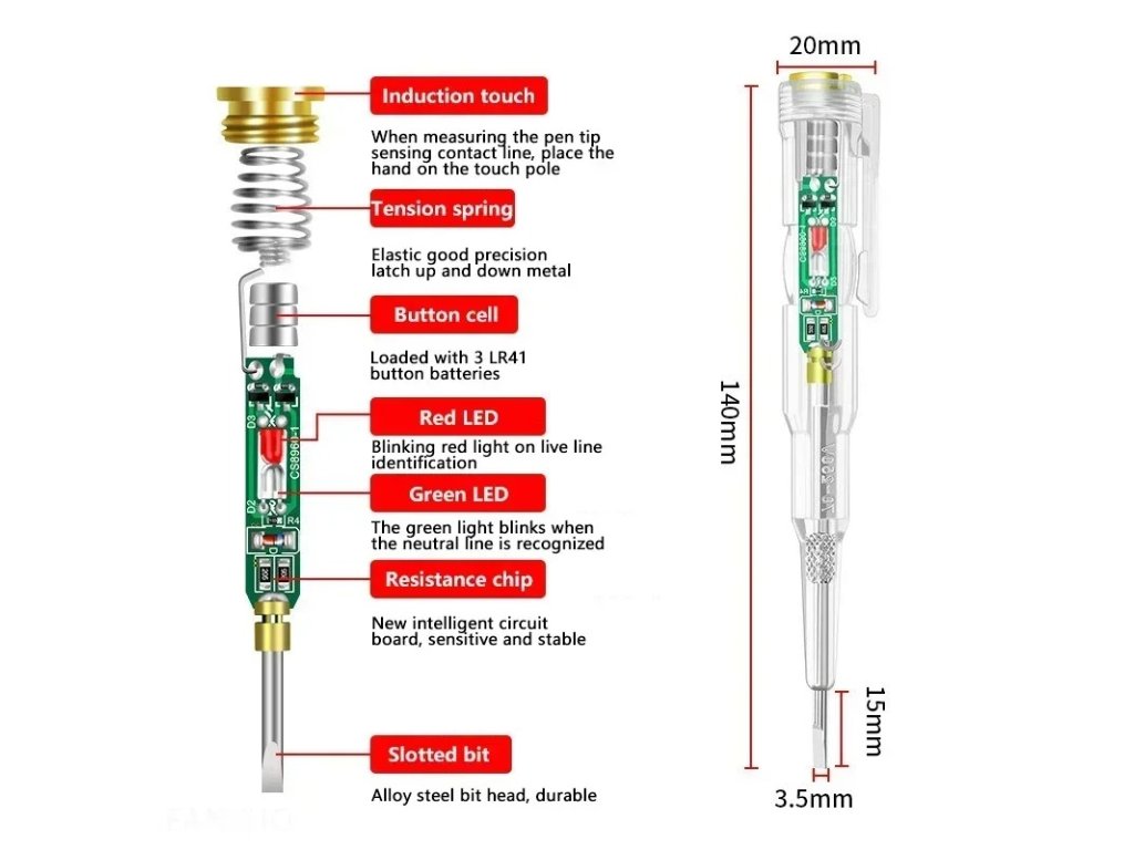 Profesionálny tester napätia v tvare šrobováka s viacfarebnou LED indikáciou slúži na detekciu prítomnosti elektrického prúdu v fázovom alebo nulovom vodiči. Vďaka kompaktnému dizajnu je ľahko prenosný a rýchlo dostupný pri každej elektroinštalácii. Používanie je jednoduché – stačí priložiť hrot k vodiču alebo svorke.